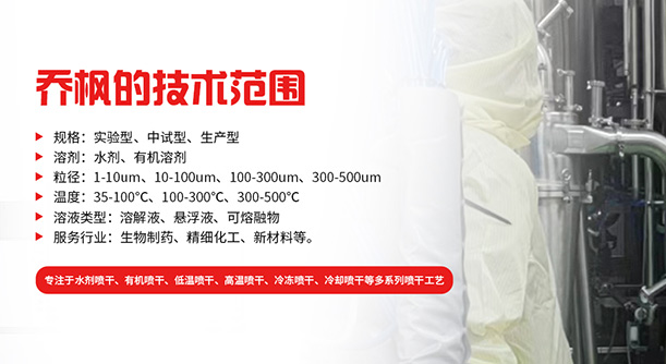 上海喬楓實業有限公司,成立于2012年,是從事噴霧干燥設備的研發設計、生產、銷售(小型噴霧干燥機實驗型噴霧干燥機,35℃低溫噴霧干燥機,有機溶劑噴霧干燥機,低溫閉式循環噴霧干燥機超細粉末噴霧干燥機、噴霧冷凍干燥機、真空噴霧干燥機、氣流噴霧干燥機噴霧造粒干燥機離心噴霧干燥機,沸騰制粒機等)和售后于一體的綜合性公司,本公司現成為一家致力于為生物制藥、精細化工、新能源、陶瓷造粒及食品工程等領域提供全套解決方案的整線交鑰匙工程企業。